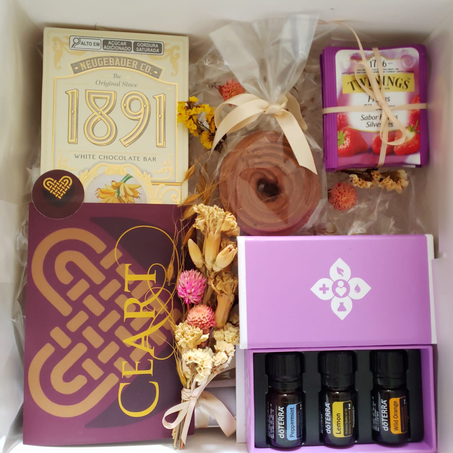 _Caixa cartonada, fita de cetim e arranjo para dar um toque final, acompanha um cartão Ceart para sua mensagem de felicitação.